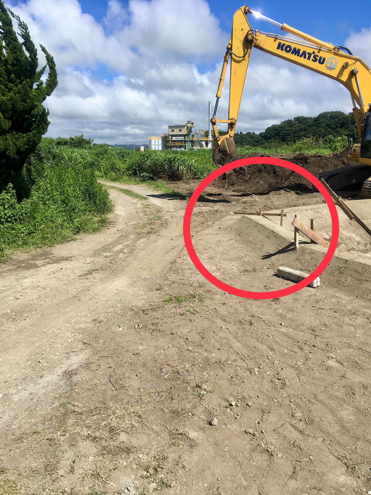 入り口ゲートから見ると、ちょうど重機がある辺りの進入路すぐ脇に工事箇所があるので注意の方、宜しくお願いします。