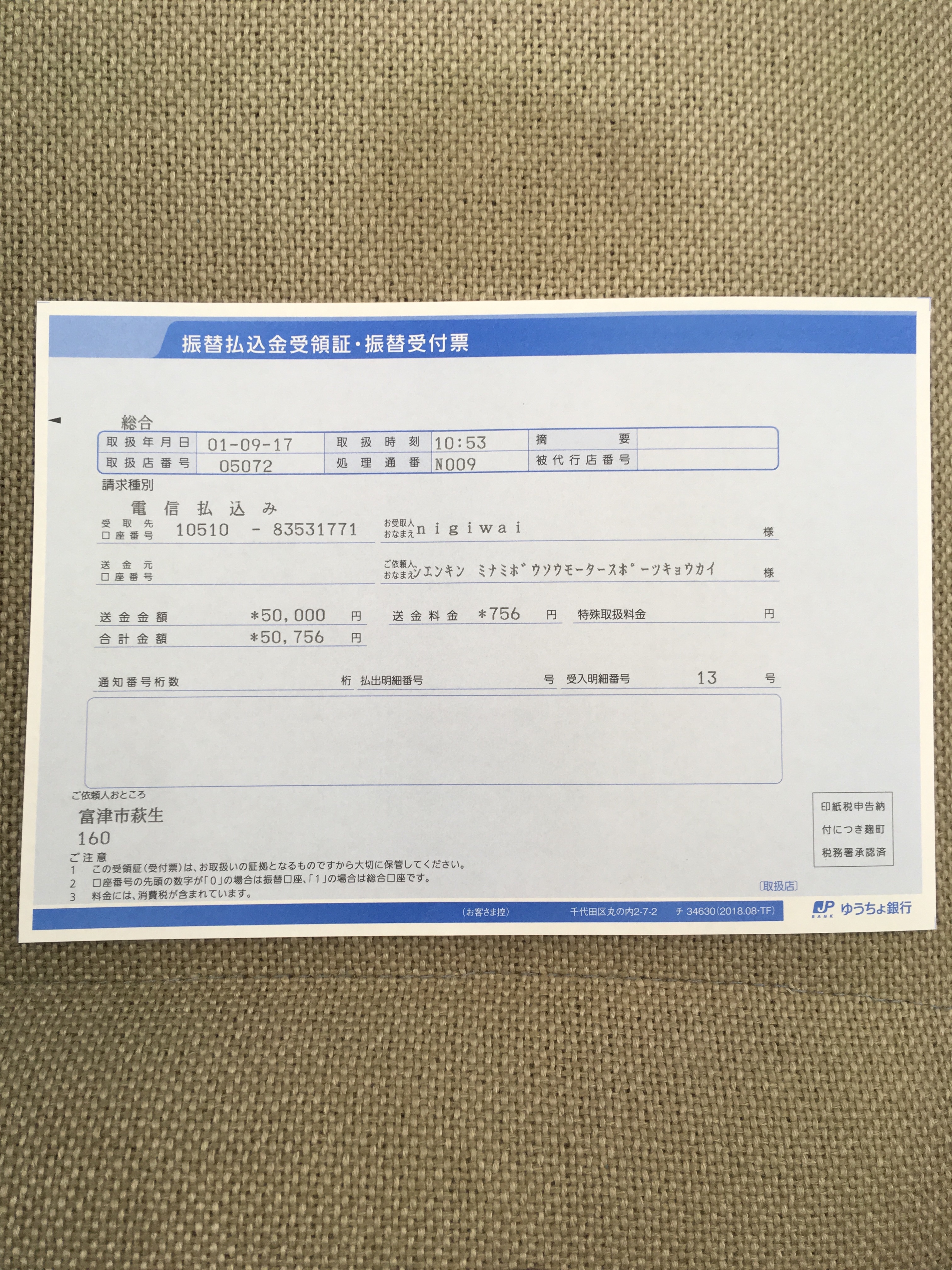 に支援金として5万円を送らせていただきました。